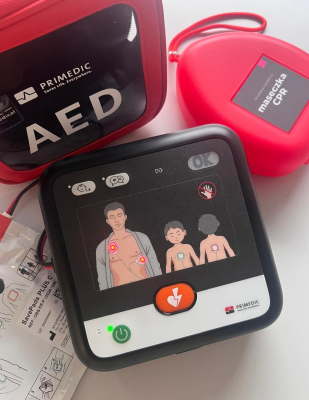 AED sam monitoruje baterię, elektronikę, stan elektrod i gotowość do pracy.